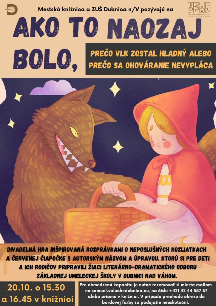 Príďte si pozrieť divadelnú hru inšpirovanú rozprávkami o neposlušných kozliatkach a Červenej čiapočke s autorským názvom a úpravou, ktorú si pre deti a ich rodičov pripravili žiaci literárno-dramatického odboru Základnej umeleckej školy v Dubnici nad Váhom.
