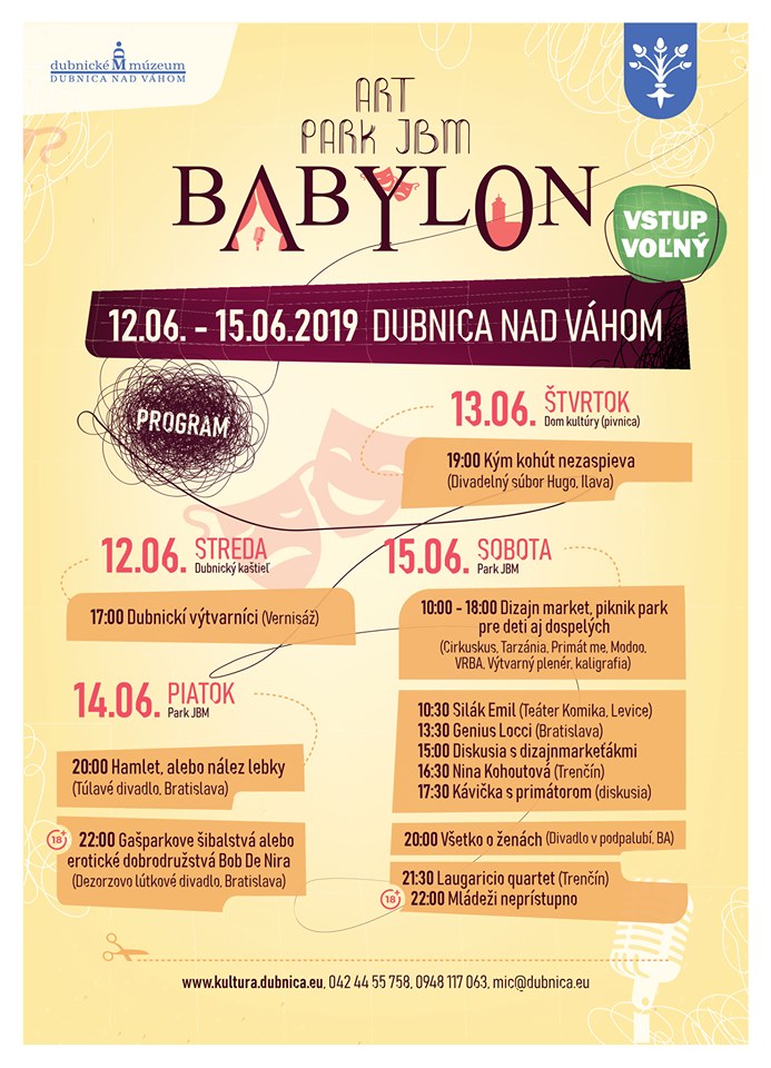 Súčasťou podujatia budú divadlá, koncerty, besedy, vernisáže, výtvarné plenéry aj markety – všetko spojené s kultúrou a umením. Ale v prvom rade pôjde o zábavu, relax a príjemnú umeleckú atmosféru v našom meste. Babylon začne už v stredu vernisážou, vo štvrtok bude pokračovať divadelnými predstaveniami. Ja osobne sa teším na dizajnmarket, v rámci ktorého sa predvedú rôzni kreatívni výrobcovia zaujímavých a štýlových vecí, či posedenie na koncerte Niny Kohoutovej pri grotte alebo večerný koncert Laugarícia kvartetu s jeho hosťami.