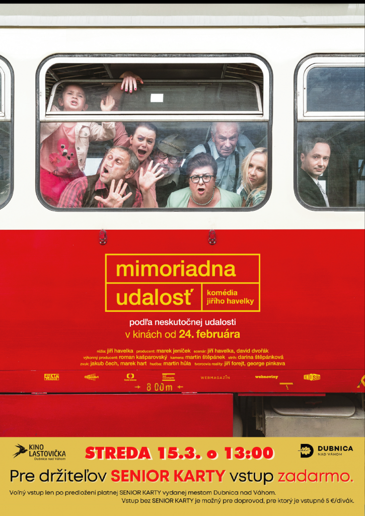 Pozývame všetkých držiteľov SENIOR KARTY na bezplatnú projekciu českej komédie MIMORIADNA UDALOSŤ v stredu 15. marca o 13.00 h v Kine Lastovička.