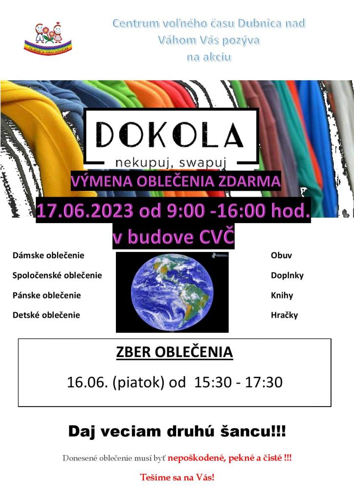 Centrum voľného času Dubnica nad Váhom pozýva 17. júna na swap (výmenu) oblečenia, obuvi, doplnkov, kníh aj hračiek. Akcia bude trvať od 9.00 h. do 16.00 h.