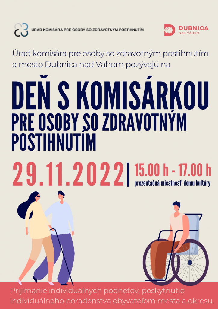 V čase od 15.00 h do 17.00 h bude komisárka pre osoby so zdravotným postihnutím k dispozícii pre verejnosť na stretnutí s občanmi v prezentačnej miestnosti domu kultúry (prízemie vľavo). Počas tohto stretnutia sa môžu na Zuzanu Stavrovskú a jej tím obrátiť občania so zdravotným znevýhodnením so svojimi podnetmi a využiť individuálne poradenstvo.