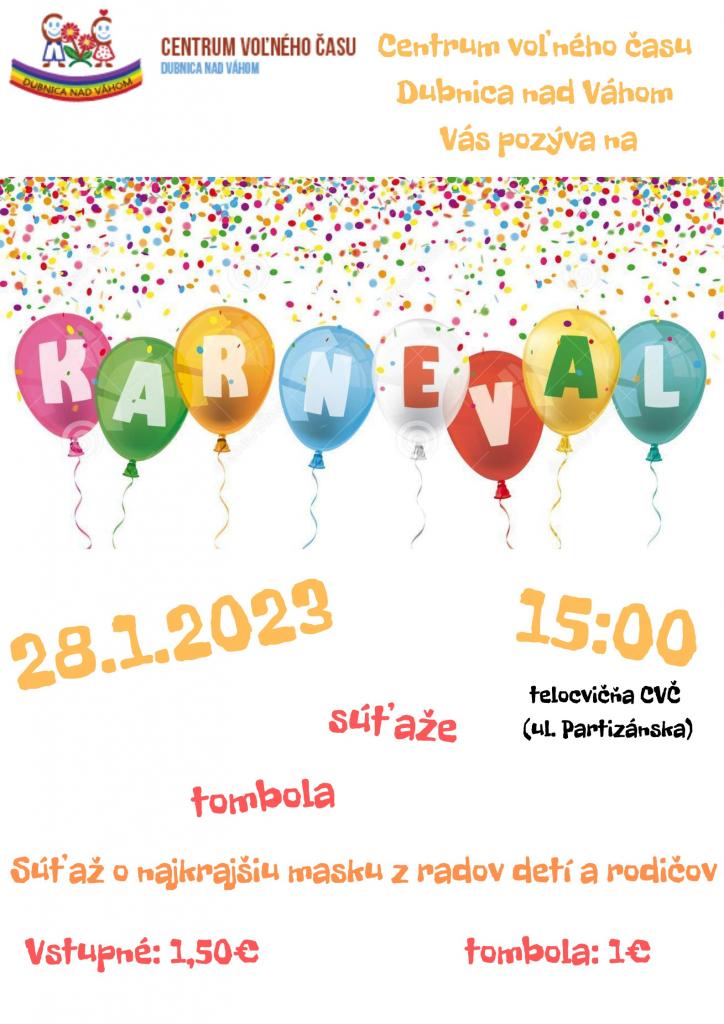V sobotu 28. januára 2023 sa na vás srdečne teší kolektív Centra voľného času Dubnica nad Váhom - karneval sa uskutoční v telocvični na Partizánskej ulici (bývalá II. ZŠ). Nebude chýbať ani tombola a súťaž o najkrajšiu masku z radov detí i rodičov.