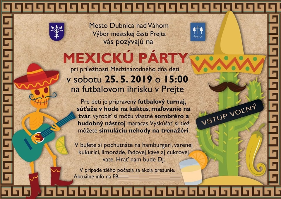 Mesto Dubnica nad Váhom a Výbor mestskej časti Prejta všetkých v sobotu 25. mája 2019 srdečne pozývajú na Futbalové ihrisko v Prejte, kde sa od 15.00 h uskutoční pri príležitosti Medzinárodného dňa detí Mexická párty.