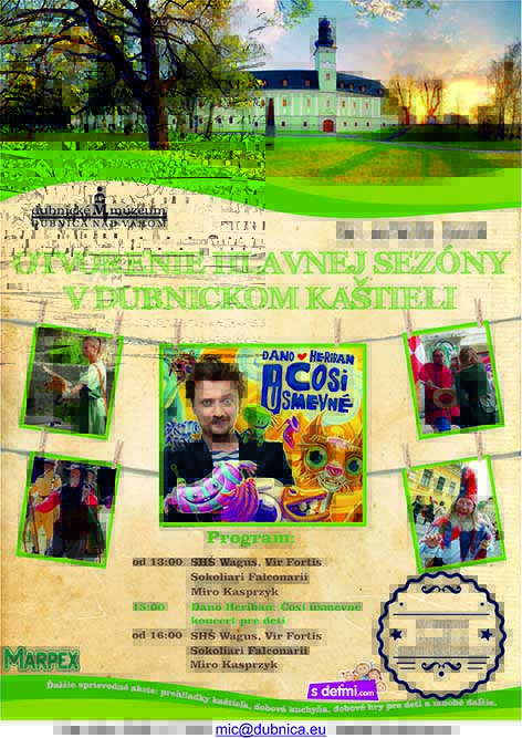 V poslednú aprílovú nedeľu sme pre vás pripravili bohatý program na nádvorí Dubnického kaštieľa, ktorý začne od 13.00 a potrvá cca do 18.00 hod. Okrem prehliadok kaštieľa na vás čakajú rôzne hry pre deti, ochutnávka dobovej kuchyne, fotenie v dobových kostýmoch, ale hlavne: