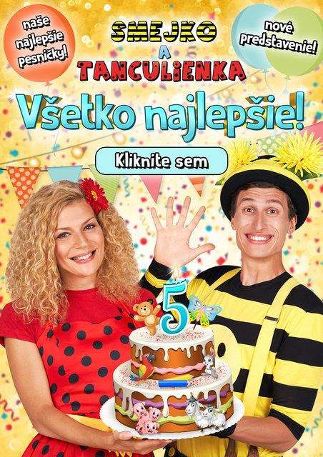 Piate výročie populárnej dvojice Smejko a Tanculienka oslávime najväčšími rozprávkovými a tanečnými hitmi. Pred hladným vlkom zachránime Kozliatka aj Macka. Zase priletí náš večne opakujúci sa Papagáj a dedko príde vytiahnuť repku. Nových chrobáčikov vychováme s pesničkou Nonono tytyty a tiež ich naučíme nový tanec Šlapy šlapy. Rozpletieme Motáčika Popletáčika a vystrašíme Babu Jagu.
