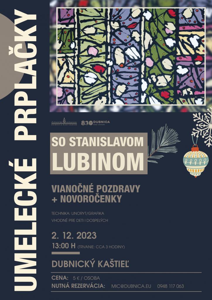 Už túto sobou 2. decembra 2023 nás poctí svojou návštevou výtvarník Stanislav Lubina, ktorý má v Dubnickom kaštieli aktuálne vystavené svoje diela a v našej obľúbenej výtvarnej dielni "Umelecké prplačky" sa bude venovať deťom i dospelým.