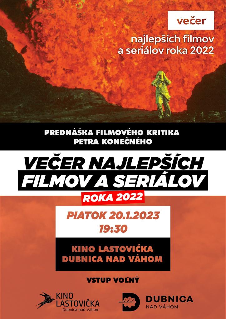 Rok 2022 priniesol mimoriadne diela v oblasti svetovej kinematografie a seriálovej televíznej produkcie. Počas filmového večera si predstavíme len to najlepšie z moderného vnímania audiovizuálneho umenia. Je pozoruhodné, ako sa tento druh tvorby stále vyvíja a hľadá nové cesty ako zaujať často presýtených divákov a diváčky. Nestrácajte čas s priemernosťou a balastom. K slovu sa tentoraz dostane iba kvalita. A sprevádzať vás ňou bude šéfredaktor portálu Kinema.sk, spoluautor filmovej relácie Do Kina v rádiu Slovensko a člen programového tímu najdiváckejšieho slovenského filmového festivalu Cinematik - Peter Konečný. Predstaví vám desiatky mimoriadnych filmov a seriálov ostatných mesiacov, ktoré ho skutočne zaujali.